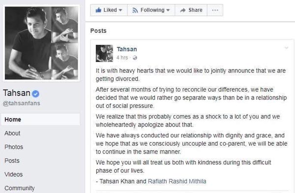 তাহসান তাঁর ফেসবুকে লিখেছেন, ‘ভারাক্রান্ত হৃদয় নিয়ে আমরা ঘোষণা করছি যে, খুব শিগগিরই আনুষ্ঠানিক ডিভোর্স হবে আমাদের। যে মতপার্থক্যগুলো আমাদের মধ্যে গত কয়েকমাস ধরে তৈরি হয়েছে আমরা সেগুলো দূর করার চেষ্টা করেছিলাম। এরপরেই আমরা সিদ্ধান্ত নিয়েছি, সামাজিক চাপে পড়ে সম্পর্কে থাকার চেয়ে বিচ্ছেদই ভাল।’