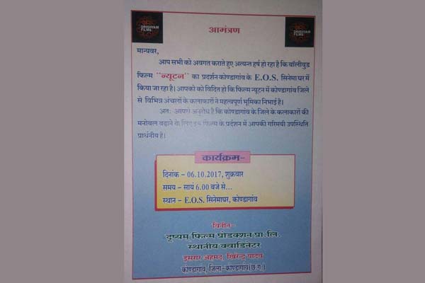 কোন্দগাঁওতে সিনেমা দেখতে যাওয়ার জন্য আমন্ত্রণপত্র। ছবি সৌজন্যে: ফেসবুক।