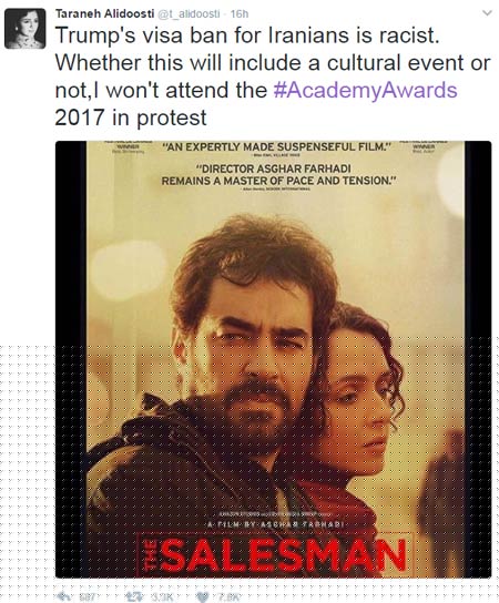 অস্কার পাওয়ার জন্য মুখিয়ে থাকেন পৃথিবীর হাজার হাজার পরিচালক, অভিনেতা, সঙ্গীতশিল্পী। অস্কারে মনোনয়ন পাওয়াটাও বিনোদন দুনিয়ায় একটা অত্যন্ত সম্মানের বিষয়। যেখানে এই পুরস্কার মঞ্চে বা অনুষ্ঠানে উপস্থিত থাকাটাও বেশ গৌরবের বলে মনে করেন বেশির ভাগ, সেখানে অস্কারের অনুষ্ঠান বয়কট করলেন অস্কারের জন্য মনোনীত বিদেশি ছবি ‘দ্য সেলসম্যান’-এর অভিনেত্রী ইরানের জনপ্রিয় তারকা তারানে আলিদুসতি। কেন এমন সিদ্ধান্ত নিলেন তিনি? অভিনেত্রীর দাবি, মার্কিন প্রেসিডেন্ট ডোনাল্ড ট্রাম্পের সাম্প্রতিক ইরানিয়ান ভিসা বাতিলের সিদ্ধান্তের বিরোধিতায় অস্কার অনুষ্ঠান বয়কট করছেন তিনি। টুইট করে তারানে জানিয়েছেন, “ইরানিদের ভিসার উপর এই নিষেধাজ্ঞা বর্ণবিদ্বেষমূলক। জানি এটি একটি সাংস্কৃতিক মঞ্চ, তবু এর বিরোধিতায় আমি অ্যাকাডেমি অ্যাওয়ার্ডের অনুষ্ঠানে আসব না।”