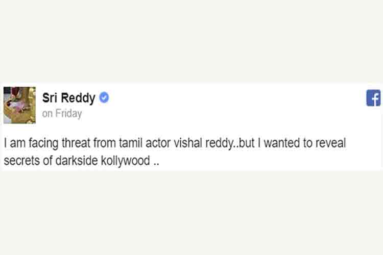 সোশ্যাল মিডিয়ায় শ্রী লেখেন, ‘তামিল অভিনেতা বিশাল রেড্ডি আমাকে হুমকি দিচ্ছে। কিন্তু আমি কলিউড ইন্ডাস্ট্রির কালো দিকটা সামনে আনতে চাই।...’ তামিল ফিল্ম প্রোডিউসার কাউন্সিলের প্রেসিডেন্ট বিশাল। ফলে তিনি ইন্ডাস্ট্রির প্রভাবশালী ব্যক্তি বলেই দাবি শ্রীর।