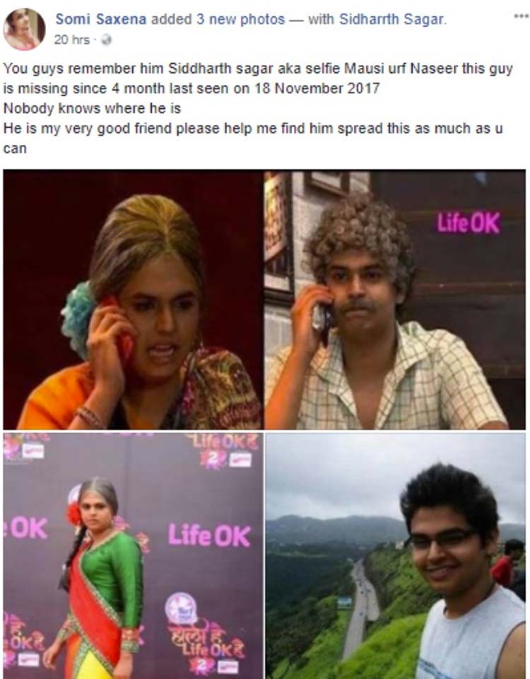 ওই কমিক চরিত্রের আড়ালে থাকা অভিনেতা সিদ্বার্থ সাগর গত চার মাস ধরে নিখোঁজ। বিষয়টি প্রথম নজরে আসে সোনি সাক্সেনা নামের জনৈক মহিলার সাম্প্রতিক ফেসবুক পোস্ট থেকে।