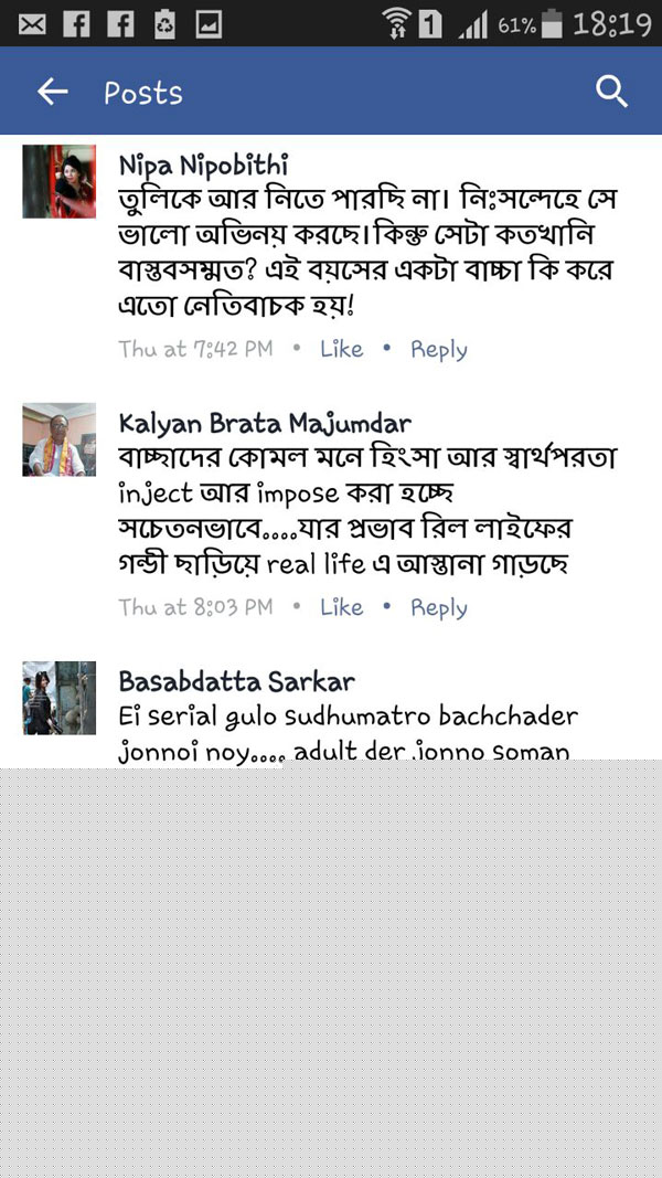 ‘‘ওরা তো ছোট। কোনটা অভিনয় আর কোনটা আসল সেটা বুঝতে পারে না। ফলে ব্যবহারে চেঞ্জ আসতে পারে। আমার মেয়েই তো টিভিতে দেখে কখনও বলে, দেখ তুলি কত দুষ্টু! তবে এর একটা অন্য দিকও আছে। সেটা নিয়েও আলোচনা হওয়া দরকার।’’