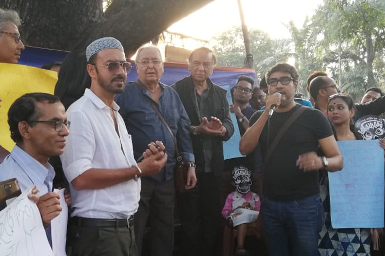 অ্যাকাডেমির প্রতিবাদ সভা থেকে সব্যসাচী চক্রবর্তী প্রশ্ন তোলেন, ‘‘রিলিজের আগে ছবির বিষয় জানতে চেয়ে পুলিশের তরফে একটা চিঠি দেওয়া হয়েছিল। কনটেন্ট জানতে চাওয়ার মানে আপনি পুলিশের নজরে আছেন। তার মানে কি ভয় দেখানো? ক’দিন আগে ব্রিগেড থেকে এত গালাগালি করা হল, তাতে ভয় পেল না, আমাদের সিনেমাটা কি তার থেকেও ভয়ের? একটা সিনেমা কি রাজনৈতিক জমায়েতের থেকে বড় হতে পারে?’’ অভিনেতা সাহেব ভট্টাচার্য স্পষ্ট বলেন, ‘‘কারও খামখেয়ালী সিদ্ধান্তে, গায়ের জোরে কি সিনেমা বন্ধ হয়ে যেতে পারে? ট্রান্সপারেন্সি নেই আমাদের সমাজে।’’