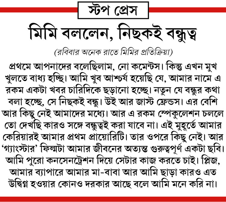 ঘটনার সূত্রপাত তুরস্কে। গত সপ্তাহ পর্যন্ত সেখানেই চলছিল অভিনেতা যশ দাশগুপ্তের প্রথম ছবি ‘গ্যাংস্টার’য়ের শ্যুটিং। যেখানে নায়িকার ভূমিকায় ছিলেন মিমি। না, নায়কের সঙ্গে তাঁর সম্পর্ক তৈরি হয়নি। কলকাতা থেকে সেই শ্যুটিং কভার করতে আনন্দplus-এর এই প্রতিবেদক হাজির ছিলেন। তখনই কানাঘুষো শোনা যাচ্ছিল। দিন দু’য়েক আগে ইউনিট কলকাতায় নামার পর শোনা যায় গুঞ্জনই সত্যি, নতুন প্রেমে পড়েছেন মিমি। কলকাতা নেমে মিমি তাঁর স্বাভাবিক জীবনযাত্রা বজায় রেখেছেন। রোববার শ্যুটিংয়ের ছবি টুইট করেছেন। তার আগের রাতে এবিপি আনন্দ সেরা বাঙালি সঞ্চালনা করেছেন। আনন্দplus তাঁর প্রেমে পড়া নিয়ে যোগাযোগ করলে তিনি বলেন, আমায় ছেড়ে দিন। আমার এ নিয়ে কিছু বলার নেই।