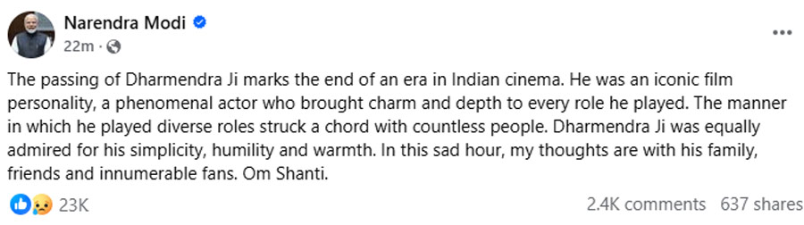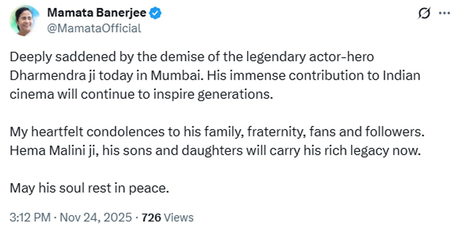 শোকজ্ঞাপন করেন প্রধানমন্ত্রী নরেন্দ্র মোদী এবং মুখ্যমন্ত্রী মমতা বন্দ্যোপাধ্যায়। মোদীর পোস্টে স্পষ্ট, তিনি ধর্মেন্দ্রের অভিনয়ে মুগ্ধ ছিলেন। তাই তিনি লেখেন, “যে ভাবে তিনি ভিন্ন ভিন্ন ধরনের ছবিতে অভিনয় করেছিলেন তার সঙ্গে অগুনতি মানুষ একাত্ম বোধ করতে পারতেন। অভিনয়ের পাশাপাশি বিনয়, নম্রতা ও আন্তরিকতার জন্যেও ধর্মেন্দ্রকে মানুষ ভালবেসেছেন। এই দুঃখের মুহূর্তে আমার সমবেদনা রইল ওঁর পরিবার, পরিজন, বন্ধুবান্ধব ও অসংখ্য অনুরাগীর প্রতি। ওম শান্তি।”
