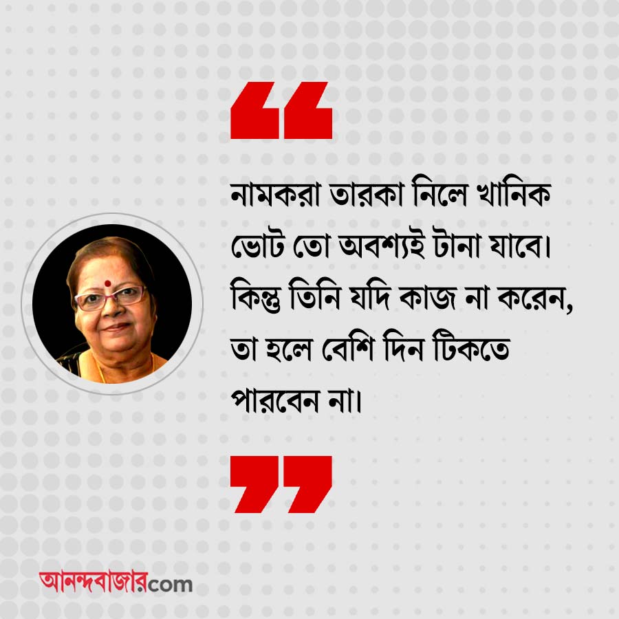 লিলি: নামকরা তারকা নিলে খানিক ভোট তো অবশ্যই টানা যাবে। কিন্তু তিনি যদি কাজ না করেন, তা হলে বেশি দিন টিকতে পারবেন না।