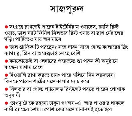সফ্টওয়্যার ডেভেলপার পৃথু লাহিড়ির আবার নেমন্তন্ন বিশেষ বন্ধুর বিয়ের আগের ব্যাচেলর্স পার্টিতে। তবে পশ্চিমী নয়, একটু অন্য রকম দেখাতে তিনি পরবেন ডিজাইনার পঞ্জাবি। সঙ্গে স্কার্ফের ধরনে হাল্কা শাল। শিশির ভেজা পার্টি যে চলবে অনেক রাত পর্যন্ত।