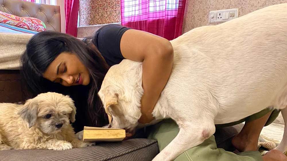 লকডাউনে বাড়িতে আটকে, প্রিয় পোষ্যদের সঙ্গে খুনসুটিতে ব্যস্ত পার্নো। নিজস্ব চিত্র।