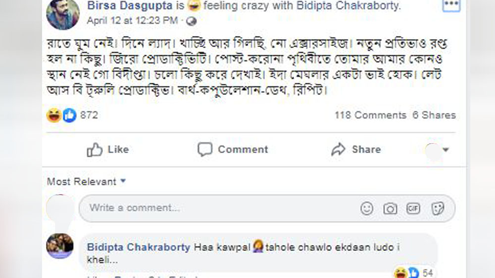 ফেসবুকে একটি পোস্ট করেছেন বিরসা। রাখঢাক না করেই তিনি লিখেছেন, “রাতে ঘুম নেই। দিনে ল্যাদ। খাচ্ছি আর গিলছি, নো এক্সারসাইজ। নতুন প্রতিভাও রপ্ত হল না কিছু। জিরো প্রোডাক্টিভিটি। পোস্ট-করোনা পৃথিবীতে তোমার আমার কোনও স্থান নেই গো বিদীপ্তা। চলো কিছু করে দেখাই। ইদা মেঘলার একটা ভাই হোক। লেট আস বি ট্রুলি প্রোডাক্টিভ। বার্থ-কপুউলেশান-ডেথ, রিপিট।”