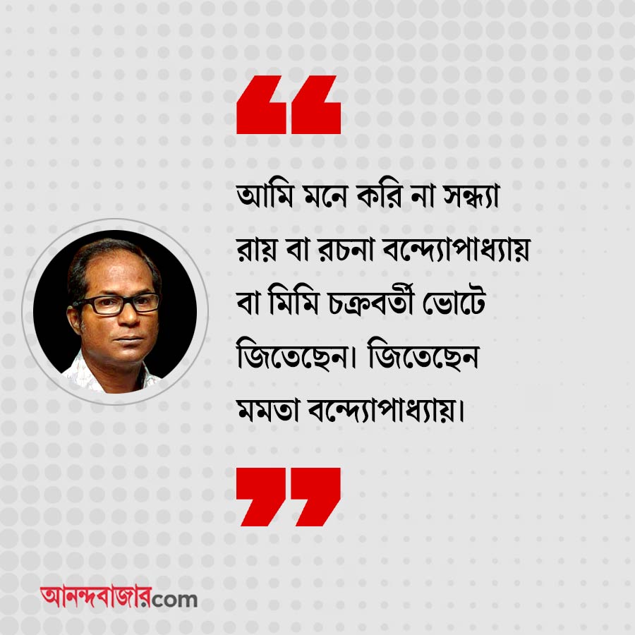 চন্দন: আমি মনে করি না সন্ধ্যা রায় বা রচনা বন্দ্যোপাধ্যায় বা মিমি চক্রবর্তী ভোটে জিতেছেন। জিতেছেন মমতা বন্দ্যোপাধ্যায়। ব্যাপারটা হচ্ছে, ওই সব আসনে দলীয় কোন্দল এমন একটা জায়গায় আছে যে কাউকে প্রার্থী না করে বাইরের একজনকে বসিয়ে দেওয়া হয়!