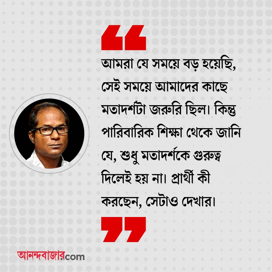 চন্দন: আমরা যে সময়ে বড় হয়েছি, সেই সময়ে আমাদের কাছে মতাদর্শটা জরুরি ছিল। কিন্তু আমার পারিবারিক শিক্ষা থেকে জানি যে, শুধু মতাদর্শকে গুরুত্ব দিলেই হয় না। প্রার্থী কী করছেন, সেটাও দেখার। যাঁরা ভোটে লড়তে আসছেন, তাঁরা যে প্রতিশ্রুতি দিচ্ছেন, তার কতখানি প্রয়োগ করতে পারছেন, সেটাও দেখা জরুরি। সাফল্য-ব্যর্থতা পরের ব্যাপার। আমাদের দেশের যা পরিস্থিতি, তাতে সব প্রয়োগ সাফল্য পাবে, এর কোনও মানে নেই।