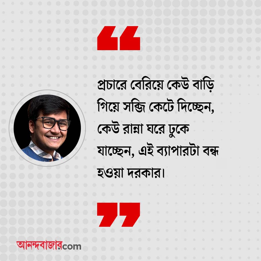 ঋতব্রত: একটাই প্রক্রিয়া কাজে আসতে পারে। সেটা হল, সর্ব স্তরে প্রচার বন্ধ করে দেওয়া। প্রচারে বেরিয়ে কেউ বাড়ি গিয়ে সব্জি কেটে দিচ্ছেন, কেউ রান্নাঘরে ঢুকে যাচ্ছেন, এই ব্যাপারটা বন্ধ হওয়া দরকার।