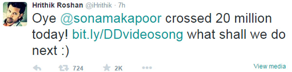 মিউজিক ভিডিও ‘ধীরে ধীরে’তে প্রথম বার এক সঙ্গে জুটি বেঁধেছেন হৃতিক রোশন এবং সোনম কপূর। ১ সেপ্টেম্বর মুক্তি পেয়েছে ভিডিওটি। ইতিমধ্যেই দু’কোটি হিট হয়েছে ইউটিউবে। দর্শকদের তুমুল সাড়া মেলায় খুশি নায়ক-নায়িকা। শুক্রবার নিজেই টুইট করে সোনমকে এ কথা জানিয়েছেন হৃতিক। তাঁর কথায়, ‘সোনম, ২০ মিলিয়ল ক্রস করে গেল। এর পর আমরা একসঙ্গে কী করব?’ জবাবি টুইটে সোনম লিখেছেন, ‘একসঙ্গে একটা ছবি করলে কেমন হয়!’ এ প্রসঙ্গে প্রযোজক ভূষণ কুমারকেও অভিনন্দন জানিয়েছেন হৃতিক।