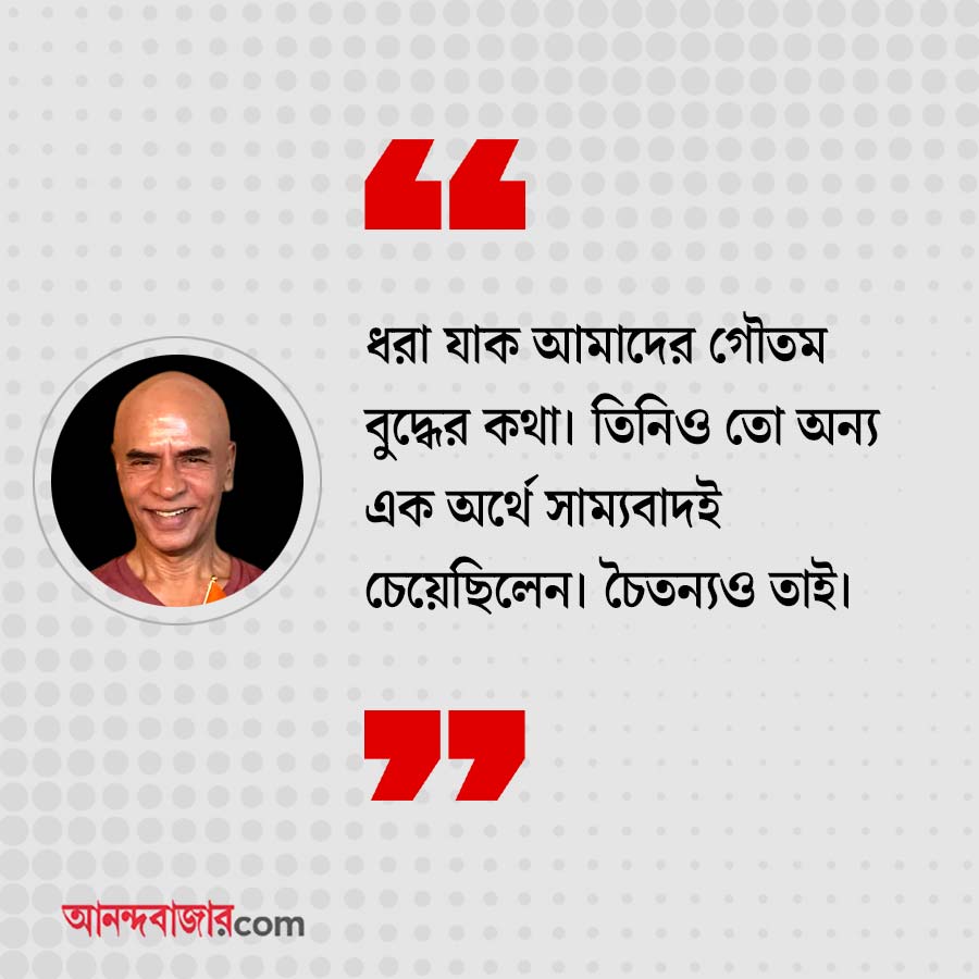 গৌতম: সংস্কৃতিই আমার কাছে প্রধান। সংস্কৃতির অঙ্গই তো সমান অধিকার এবং উন্নয়ন। আমাদের দেশে সব ধর্মকে এক ভাবে দেখার চেষ্টা হয়েছিল, এর থেকে বড় সাম্যবাদ আর কোথায়? ধরা যাক আমাদের গৌতম বুদ্ধের কথা। তিনিও তো অন্য এক অর্থে সাম্যবাদই চেয়েছিলেন। চৈতন্যও তাই।