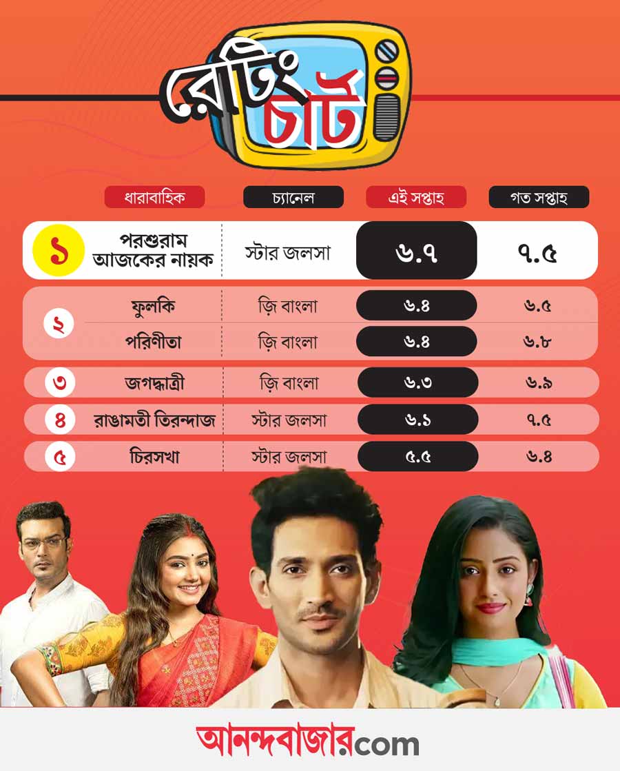 ব্যবধান মাত্র সাত দিনের। তার মধ্যেই সব গেল উল্টে-পাল্টে! গত সপ্তাহে টিআরপি তালিকায় অনেকটাই নীচের দিকে ছিল ‘পরিণীতা’ ধারাবাহিকটি। কিন্তু চলতি সপ্তাহে অনেক কিছুই বদলেছে। এই সপ্তাহে যেমন ‘স্লট লিডার’ ধারাবাহিক ‘ফুলকি’। অন্য দিকে স্লট হারালেও প্রথম পাঁচে নিজেদের জায়গা ধরে রেখেছে ‘রাঙামতী তিরন্দাজ’। এত ধারাবাহিকের ভিড়ে এই সপ্তাহেও প্রথমে রয়েছে ‘পরশুরাম আজকের নায়ক’। তৃণা সাহা এবং ইন্দ্রজিৎ বসু অভিনীত এই ধারাবাহিকের পরতে পরতে রয়েছে চমক। সুপারহিরো সব সময়ই দর্শককে বাড়তি আনন্দ দেয়। পরশুরামের চরিত্রও খানিকটা তেমনই। চলতি সপ্তাহে ৬.৭ পেয়ে প্রথমে রয়েছে এই ধারাবাহিক। যদিও আগের সপ্তাহে প্রতিটি ধারাবাহিকেরই নম্বর অনেকটা বেশি ছিল।