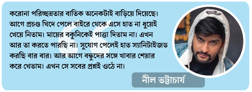 মাস খানেক আগেই করোনা সংক্রমণ থেকে ভুগে উঠলেন ‘কৃষ্ণকলি’ধারাবাহিকের ‘নিখিল। পরিচ্ছন্নতা কি বাড়াবাড়ি পর্যায়ে ঠেকেছে? নীল ভট্টাচার্যের জবাব, ‘‘করোনা পরিচ্ছন্নতার বাতিক অনেকটাই বাড়িয়ে দিয়েছে। আগে প্রচণ্ড খিদে পেলে বাইরে থেকে এসে হাত না ধুয়েই খেয়ে নিতাম। মায়ের বকুনিকেই পাত্তা দিতাম না। এখন আর তা করতে পারছি না। সুযোগ পেলেই হাত স্যানিটাইজড করছি বার বার। আর আগে বন্ধুদের সঙ্গে খাবার শেয়ার করে খেতাম। এখন সে সবের প্রশ্নই ওঠে না”।
