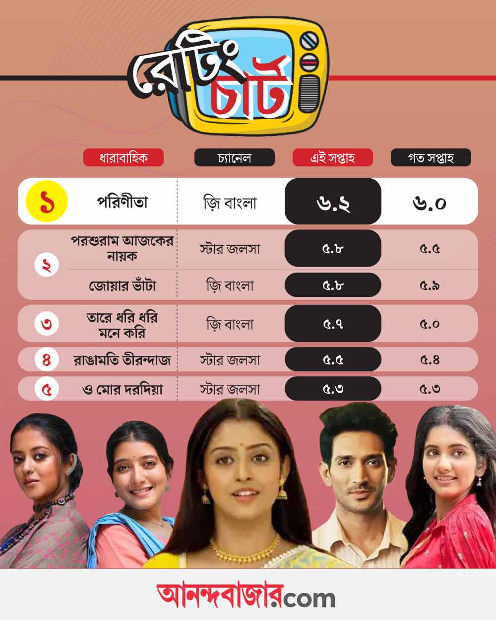 তবে চলতি সপ্তাহে ‘পরিণীতা’ ধারাবাহিকের নির্দিষ্ট কিছু দৃশ্য নিয়েও আলোচনা হয়েছে। চারিদিকে ছড়িয়ে পড়েছিল পারুল এবং রায়ানের মাটি খুঁড়ে তার তলায় থাকার দৃশ্য। এত আলোচনার পরেও টিআরপি তালিকায় শীর্ষে দেখা গেল ‘পরিণীতা’র নাম। ৬.২ পেয়ে প্রথম স্থানে রয়েছে তারা। দ্বিতীয় স্থানে দেখা গেল ‘জোয়ার ভাঁটা’ ধারাবাহিক। গত সপ্তাহ থেকেই প্রথম পাঁচের উপরের দিকে ছিল এটি। ৫.৮ পেয়েছে নিশা আর উজির কাহিনি। একই নম্বর পেয়ে দ্বিতীয় স্থানে রয়েছে ‘পরশুরাম আজকের নায়ক’ ধারাবাহিকটিও।