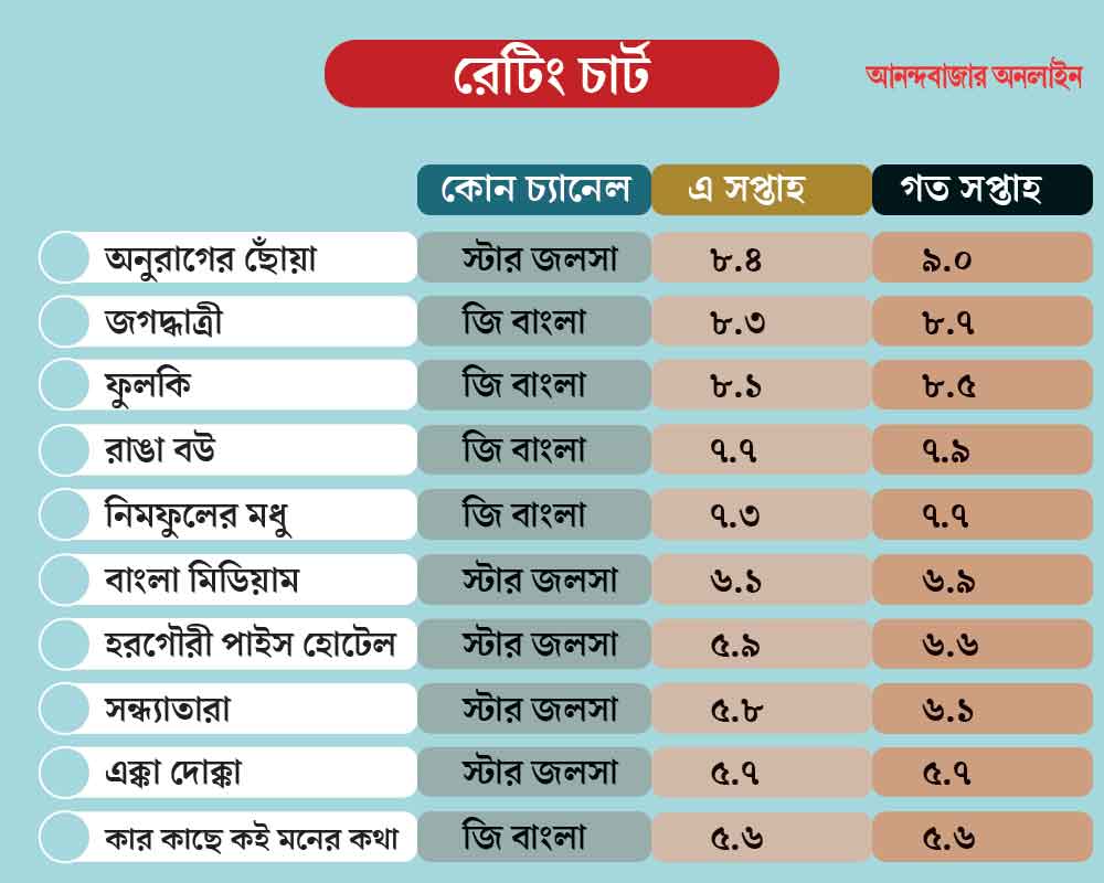 সময় যে দুরন্ত গতিতে পরিবর্তিত হয়ে চলেছে, তা প্রতি বৃহস্পতিবার আরও বেশি করে মনে করিয়ে দেয়। এককালে টিআরপি তালিকায় পয়লা নম্বরে থাকা নায়িকাদের এখন আর হদিসই পাওয়া যায় না। তাঁদের পরিবর্তে এসেছেন নতুন নতুন নায়িকারা। শেষ এক বছরে তাঁদেরই শুধু রাজত্ব। এই মুহূর্তে প্রথম তিনে দর্শক দেখছেন ‘অনুরাগের ছোঁয়া’ সিরিয়ালের স্বস্তিকা ঘোষ, ‘জগদ্ধাত্রী’ সিরিয়ালের অঙ্কিতা মল্লিক এবং ‘ফুলকি’ সিরিয়ালের দিব্যাণী মণ্ডলকে। একটা সময় এখানেই দেখা যেত সোনামণি সাহা, তিয়াসা রায়-সহ অন্য নায়িকাদের। এখনও তিয়াশা এবং সোনামণিদের সিরিয়াল সম্প্রচারিত হচ্ছে। কিন্তু সেই তালিকায় অনেকটাই পিছিয়ে এককালীন ফার্স্ট গার্লরা। অগস্ট মাসের দ্বিতীয় সপ্তাহেও প্রথম স্থানে রয়েছে ‘অনুরাগের ছোঁয়া’। সূর্য আর দীপার জীবনের জট কাটছে। ফলে দর্শকের আগ্রহও দিনে দিনে বেড়ে চলেছে। এই সপ্তাহে তাদের প্রাপ্ত নম্বর ৮.৪। গত কয়েক মাসে প্রথম তিনের জায়গায় খুব একটা পরিবর্তন হয়নি। এক মাস হল শুরু হয়েছে নতুন সিরিয়াল ‘ফুলকি’। ‘গৌরী এল’র জায়গা নিয়েছে যে সিরিয়াল। কিন্তু খুব কম সময়ের মধ্যে প্রথম দশ থেকে ছিটকে গিয়েছে ঈশান এবং গৌরীর গল্প।