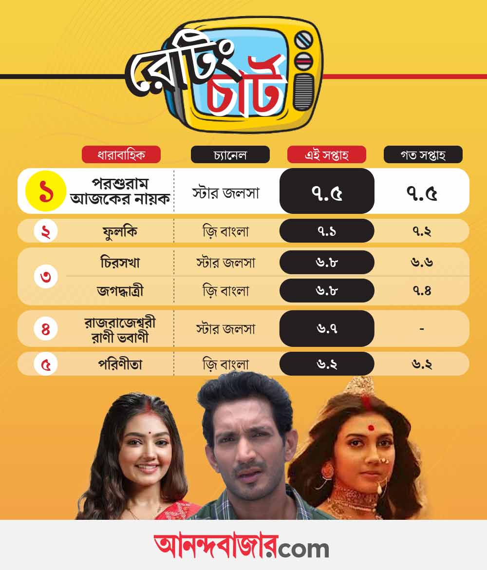 অন্য দিকে ‘ফুলকি’ ধারাবাহিকেও এসেছে নতুন মোড়। ফুলকিকে একেবারে অন্য লুকে দেখছেন দর্শক। ধারাবাহিকে দেখানো হচ্ছে নায়িকার রাজ্যাভিষেক হচ্ছে। এই নতুন গল্প যে দর্শকের ভাল লাগছে তার প্রমাণ টিআরপির নম্বর। চলতি সপ্তাহে ‘ফুলকি’ ধারাবাহিকের প্রাপ্ত নম্বর ৭.১। তৃতীয় স্থানে উঠে এসেছে ‘চিরসখা’। এই কাহিনিতে প্রতি দিন মোড় ঘুরছে। নতুন নতুন চরিত্রের আগমন হচ্ছে। আগের থেকে নম্বরও বেড়েছে। এই সপ্তাহে এই ধারাবাহিকের প্রাপ্ত নম্বর ৬.৮। এই একই নম্বর পেয়ে তৃতীয় স্থানে রয়েছে ‘জগদ্ধাত্রী’ ধারাবাহিক। চতুর্থ স্থানে রয়েছে ‘রাজরাজেশ্বরী রাণী ভবানী’। ৭ জুলাই থেকে সম্প্রচার শুরু হয়েছে এই কাহিনির। হিসেব মতো এটা তাদের দ্বিতীয় সপ্তাহ। খুব অল্প সময়েই দর্শকের মনে জায়গা করে নিয়েছে এই ধারাবাহিক। প্রথম সপ্তাহের টিআরপিতে তাদের প্রাপ্ত নম্বর ৬.৭। পঞ্চম স্থানে রয়েছে ‘রাঙামতী তিরন্দাজ’ এবং ‘পরিণীতা’ ধারাবাহিক। বহু দিন পরে প্রথম পাঁচ দেখা গেল এই ধারাবাহিককে। দুই ধারাবাহিকের প্রাপ্ত নম্বর ৬.২।