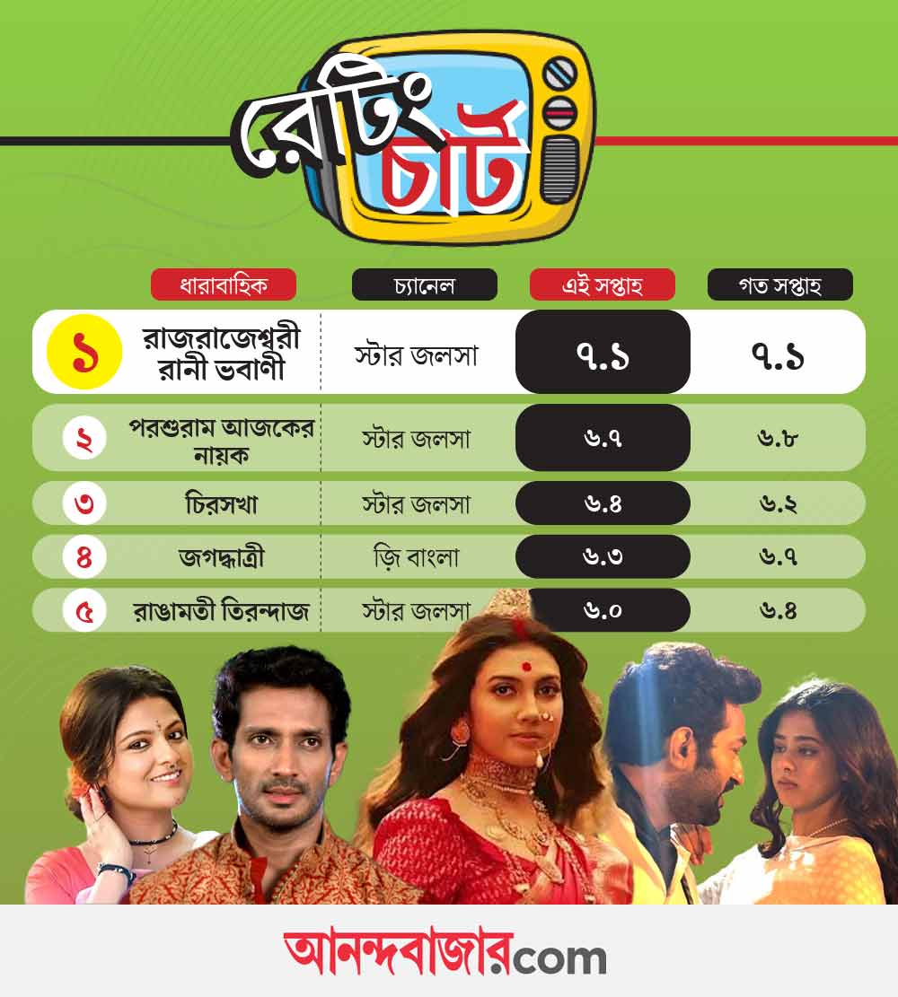 গত সপ্তাহের মতো এই সপ্তাহেও প্রথম স্থানে রয়েছে ‘রাজরাজেশ্বরী রাণী ভবানী’। তার প্রাপ্ত নম্বর ৭.১। দ্বিতীয় স্থানে রয়েছে ‘পরশুরাম আজকের নায়ক’, পেয়েছে ৬.৭। যদিও তৃণা সাহা এবং ইন্দ্রজিৎ বসু অভিনীত এই ধারাবাহিক শুরুর দিকে প্রথম স্থানেই নিজেদের জায়গা ধরে রেখেছিল। কিন্তু আগের চেয়ে নম্বর কিছুটা কমেছে।