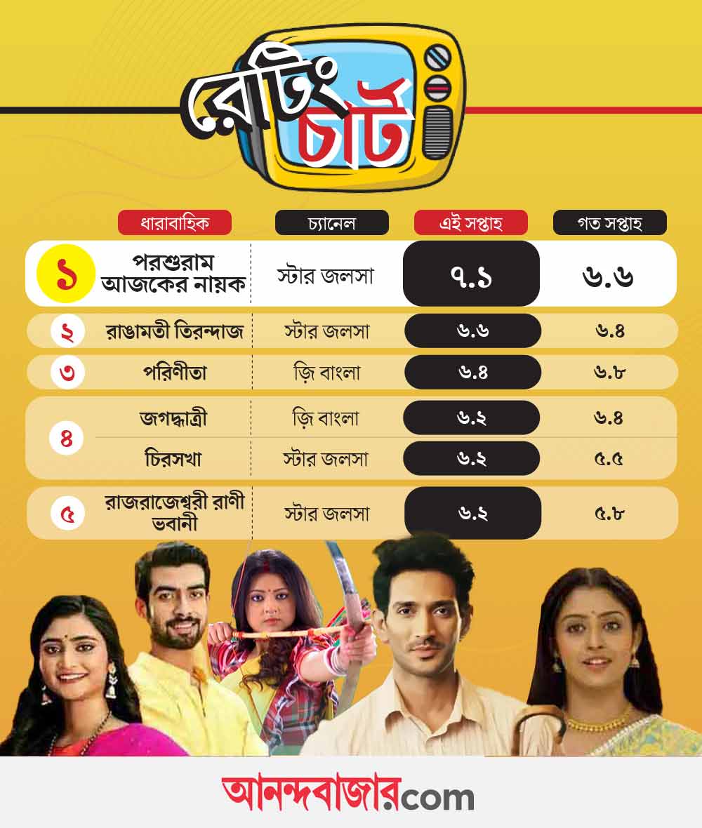 এক দিকে কমলিনী-স্বতন্ত্রের সংসার পাতার গল্প যেমন দর্শকের আগ্রহ বাড়িয়েছে, তেমনই আবার রায়ান-পারুলের কাহিনি অনেকটাই পিছিয়ে পড়েছে অন্যান্য সপ্তাহের তুলনায়। এ সপ্তাহে প্রথম স্থানে রয়েছে ‘পরশুরাম আজকের নায়ক’। তারা পেয়েছে ৭.১। শিকে ছিঁড়েছে ‘রাঙামতী তিরন্দাজ’ ধারাবাহিকেরও। একটা সময় শুধুই পাঁচ নম্বরে দেখা যেত এই ধারাবাহিকের নাম। তবে এই সপ্তাহে নম্বর অনেকটাই বেড়েছে আগের চেয়ে। ৬.৬ নম্বর পেয়ে দ্বিতীয় স্থানে রয়েছে এই ধারাবাহিক। তিন নম্বরে নেমে গিয়েছে ‘পরিণীতা’। সেই সঙ্গে তাদের নম্বরও কমে গিয়েছে কিছুটা।