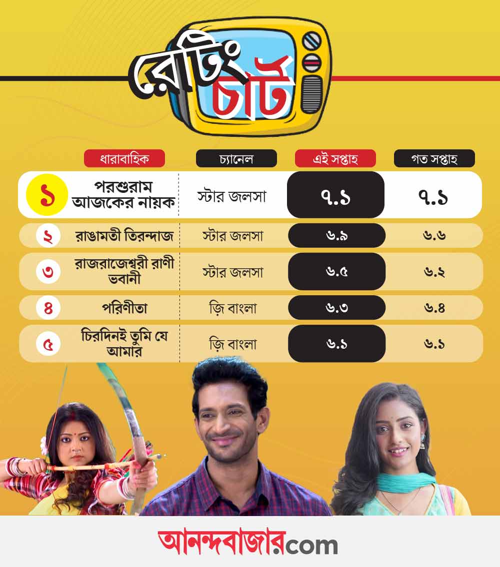 নিজেদের জায়গা ফিরে পেয়েছে ‘পরশুরাম আজকের নায়ক’। ৭.১ পেয়ে এই সপ্তাহে প্রথমে রয়েছে এই ধারাবাহিক। অনেকটাই নম্বর কমেছে ‘পরিণীতা’র। দ্বিতীয় স্থানে উঠে এসেছে ‘রাঙামতী তিরন্দাজ’। কয়েক সপ্তাহ আগে একটানা পাঁচে দেখা যেত এই ধারাবাহিকের নাম। এই সপ্তাহে নম্বর কিছুটা বৃদ্ধি পেয়েছে। ৬.৯ পেয়ে দ্বিতীয় স্থানে এই কাহিনি।
