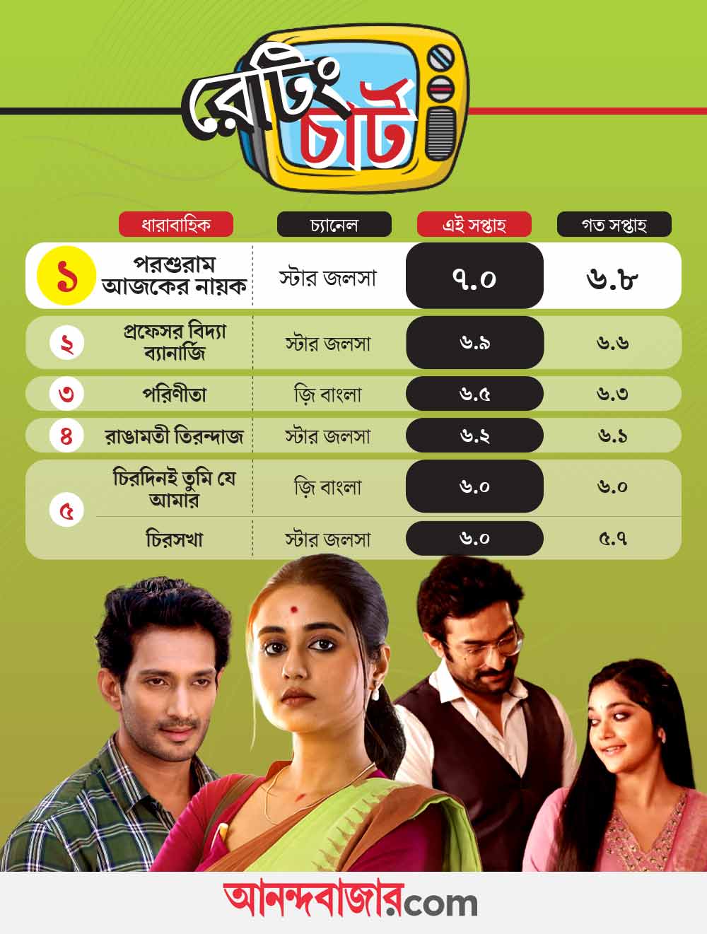 এই সপ্তাহে টেলিপাড়ায় অনেক ধরনের পরিবর্তন হয়েছে। যেমন, ‘চিরদিনই তুমি যে আমার’ ধারাবাহিকে খোঁজ চলছিল নতুন অপর্ণার। পাওয়া গিয়েছে নতুন নায়িকাকে। সদ্য শুরু হওয়া ‘প্রফেসর বিদ্যা ব্যানার্জি’ ধারাবাহিকে রাগি অধ্যাপক বিদ্যার প্রেমে হাবুডুবু খাচ্ছেন নায়ক। সেই সমীকরণও ফুটিয়ে তোলার চেষ্টা চলছে। আবার ‘পরশুরাম আজকের নায়ক’ ধারাবাহিকের গল্পের থেকেও বেশি চর্চায় কাহিনির নায়িকা তটিনী ওরফে তৃণা সাহার ব্যক্তিগত জীবন। এই সবের মধ্যেও প্রথম স্থানে ‘পরশুরাম আজকের নায়ক’। কে, কত নম্বর পেল?