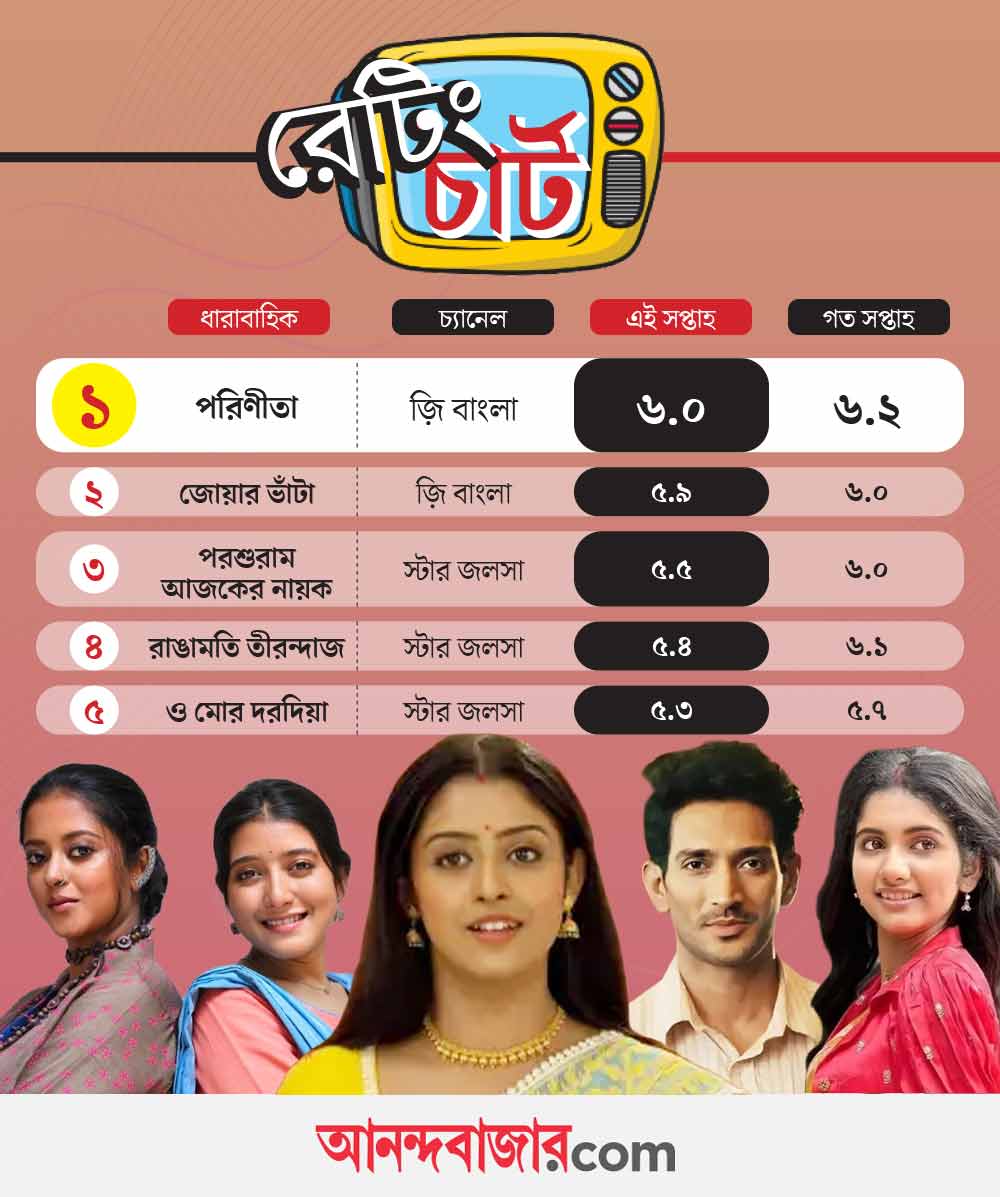 এই সপ্তাহে আরও বেশি সেই প্রভাব দেখা গেল। প্রথম পাঁচ থেকে ছিটকে গেল ‘প্রফেসর বিদ্যা ব্যানার্জি’। এই কাহিনি নিয়ে সমাজমাধ্যমেও সমালোচনার বন্যা। ধারাবাহিক সম্প্রচারের প্রথম সপ্তাহেই টিআরপি তালিকায় ছক্কা মেরেছিল এই কাহিনি। কিন্তু, গত দু’সপ্তাহে অনেকটাই পিছিয়ে পড়েছে প্রফেসর বিদ্যা। অন্য দিকে নম্বর কমলেও, নিজেদের জায়গা একই ভাবে ধরে রেখেছে ‘পরিণীতা’। সম্প্রতি, এই ধারাবাহিকের একটি নির্দিষ্ট দৃশ্যকে কেন্দ্র করে হাসাহাসিও হচ্ছে। কিন্তু তার পরেও ৬.০ পেয়ে প্রথমে রয়েছে এই ধারাবাহিক।