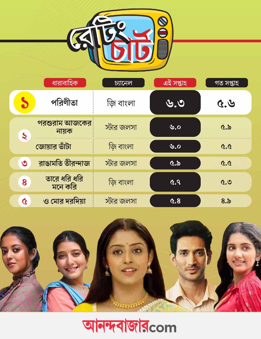 এই সপ্তাহেও প্রথম স্থানে রয়েছে পারুল এবং রায়ানের কাহিনি। নায়ক, নায়িকার সমীকরণ নিয়ে বিপুল আলোচনা এখন দর্শকমহলে। গল্পে নিত্যনতুন মোড় দেখার জন্য উদগ্রীব তাঁরা। মাঝে একটু নম্বর কমলেও এখনও নিজেদের জায়গা ধরে রেখেছে এই কাহিনি। এই সপ্তাহে তারা পেয়েছে ৬.৩। দ্বিতীয় স্থানে রয়েছে ‘পরশুরাম আজকের নায়ক’। ইন্দ্রজিৎ বসু এবং তৃণা সাহার জুটিকে প্রথম বার দেখা গেলেও, খুব অল্প সময়ের মধ্যেই দর্শকের নজর কাড়েন তাঁরা। কাহিনিতে এখন দেখানো হচ্ছে, নায়ক-নায়িকা কাছাকাছি এসেছেন। কাহিনির নতুন স্বাদ নম্বর বাড়িয়েছে। কিন্তু প্রতি সপ্তাহের মতো এ বারে তারা প্রথম স্থানে থাকতে পারেনি। ৬.০ পেয়ে দ্বিতীয় স্থানে রয়েছে এই কাহিনি। একই স্থানে রয়েছে ‘জোয়ার ভাঁটা’।