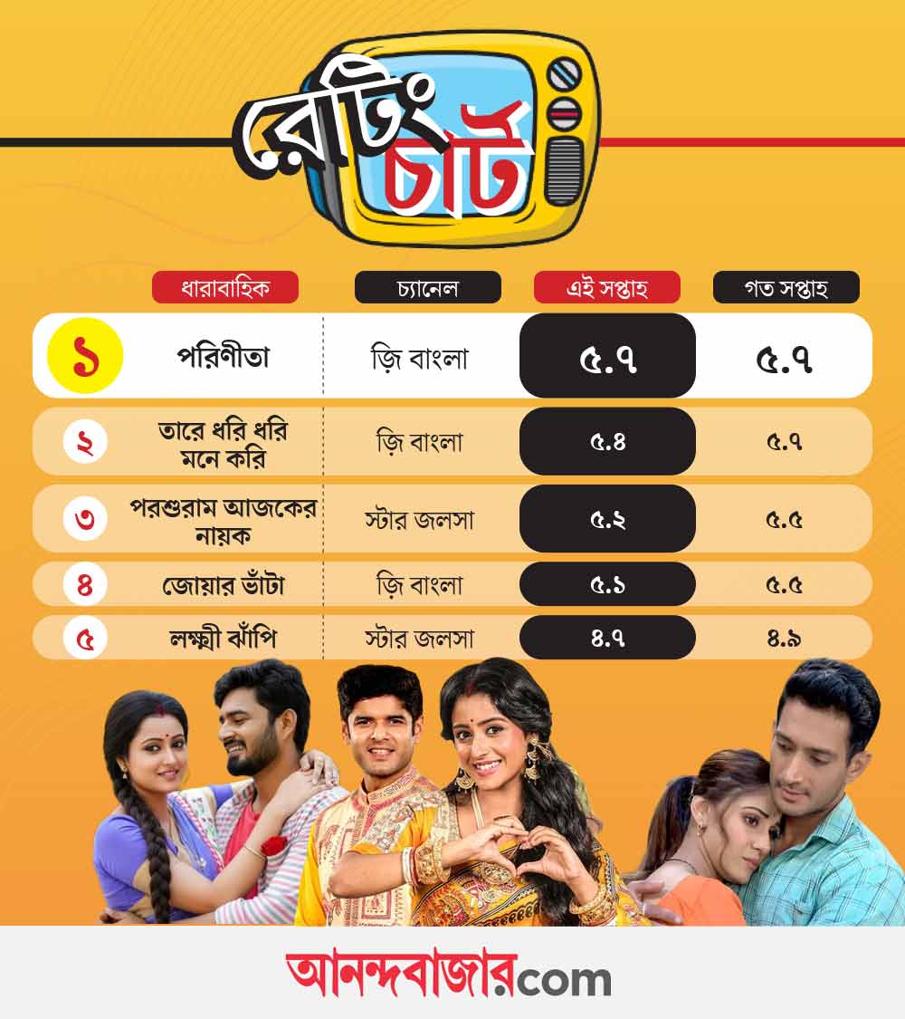 গত সপ্তাহ থেকেই হাড্ডাহাড্ডি লড়াই চলছে ‘পরিণীতা’, ‘তারে ধরি ধরি মনে করি’—দুই কাহিনির মধ্যে। এই সপ্তাহেও তাদের প্রতিযোগিতা জারি। আগের সপ্তাহে প্রথম স্থানে ছিল ‘তারে ধরি ধরি মনে করি’। এই সপ্তাহে একটুর জন্য প্রথম স্থান হারিয়েছে তারা। ৫.৪ পেয়ে দ্বিতীয় স্থানে রয়েছে এই কাহিনি। আর প্রথম স্থানে নিজেদের জায়গা ধরে রাখতে সক্ষম হয়েছে ‘পরিণীতা’। তাদের প্রাপ্ত নম্বর ৫.৭।