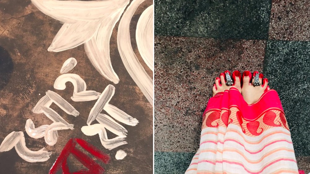 দুটো ছবিও শেয়ার করেছেন স্বস্তিকা। একটি ছবিতে আল্পনায় লেখা ‘মোহমায়া’। আর একটিতে রুপোর ভারী চুটকি পরা আলতায় রাঙা তাঁর পা।