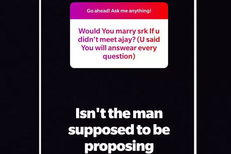 আর এক ভক্ত আবার কাজলকে প্রশ্ন করেন,আবার কবে শাহরুখ-কাজল ম্যাজিক বড় পর্দায় দেখা যাবে? উত্তরে কাজল সেই ভক্তকে বলেন, ‘সে কথা আমায় না জিজ্ঞাসা করে শাহরুখকে জিজ্ঞেস করুন।’