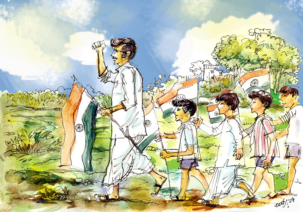 আমার পতাকারও একটা বিশেষত্ব ছিল। স্বাধীনতা দিবস, প্রজাতন্ত্র দিবস বা নেতাজির জন্মদিনের আগে মুদির দোকানে আর বইখাতার দোকানে পতাকা বিক্রি হত। ১০ পয়সা করে দাম এক-একটা পতাকার। পাট কাঠি বা কঞ্চির মাথায় সেই কাগজের পতাকা আঠা দিয়ে আটকে সব স্কুলে আসত। কেউ কেউ কাপড়ের পতাকা নিয়েও আসত। আমার কাপড়ের পতাকা ছিল না। ১০ পয়সা দামের কাগজের পতাকাও আমি কিনতাম না। বড় অঙ্ক খাতার পাতা খুলে নিয়ে বাবা তাতে তেরঙা এঁকে দিতেন। প্রথমে স্কেল দিয়ে দাগ কেটে পাতাটাকে সমান তিন ভাগ করে নিতেন। উপরের ভাগটায় গেরুয়া রং করে দিতেন। মাঝেরটা সাদাই থাকত। নীচের ভাগে সবুজ রং লাগিয়ে দিতেন। সব শেষে নীল রং দিয়ে মাঝের সাদা অংশটায় অশোক চক্র এঁকে দিতেন। এটা হত ১৪ অগস্ট সন্ধ্যায়। পতাকা আঁকা হয়ে যাওয়ার পর কাগজটা বাবা শুকোতে দিতেন। সে রাতে আমাকে আর পতাকায় হাত দিতে দিতেন না। মনটা ছটফট করত, বাবা চোখের আড়াল হলেই পতাকাটা হাত দিয়ে দেখার চেষ্টা করতাম, শুকলো কি না। তার পর অবধারিত ভাবে বাবার কাছে ধরা পড়তাম। পতাকা আঁকা কাগজটা বাবা আমার নাগালের বাইরে কোথাও একটা রেখে দিতেন। পর দিন সকালে পাটকাঠির মাথায় আঠা দিয়ে সেঁটে আমার হাতে ধরিয়ে দিতেন।
