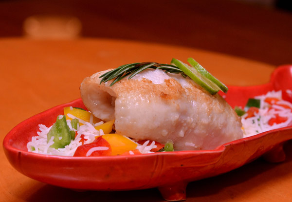 ঝরঝরে ভাত তৈরি করে প্যানে মাখন দিয়ে বেল পেপার টস করে নিয়ে ভাত নেড়ে রাখুন। সার্ভিং বোলে বেল পেপার রাইস সাজিয়ে ওপরে মাছের রোল সাজিয়ে পাতিলেবু ও বেসিল দিয়ে গরমাগরম পরিবেশন করুন। সঙ্গে দিন লেমন সস। মাখন ও চিজ এক সঙ্গে মিশিয়ে লেবুর রস ও সামান্য গোলমরিচ গুঁড়ো ছড়িয়ে নেড়ে নিলেই রেডি সস।