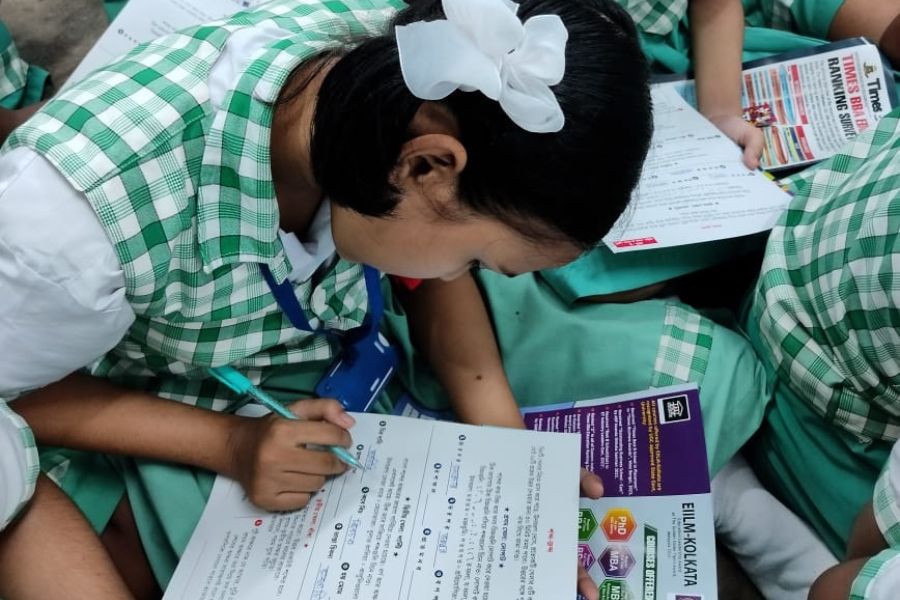 শব্দের মজার ধাঁধার উত্তর খুঁজতে ব্যস্ত এক ছাত্রী