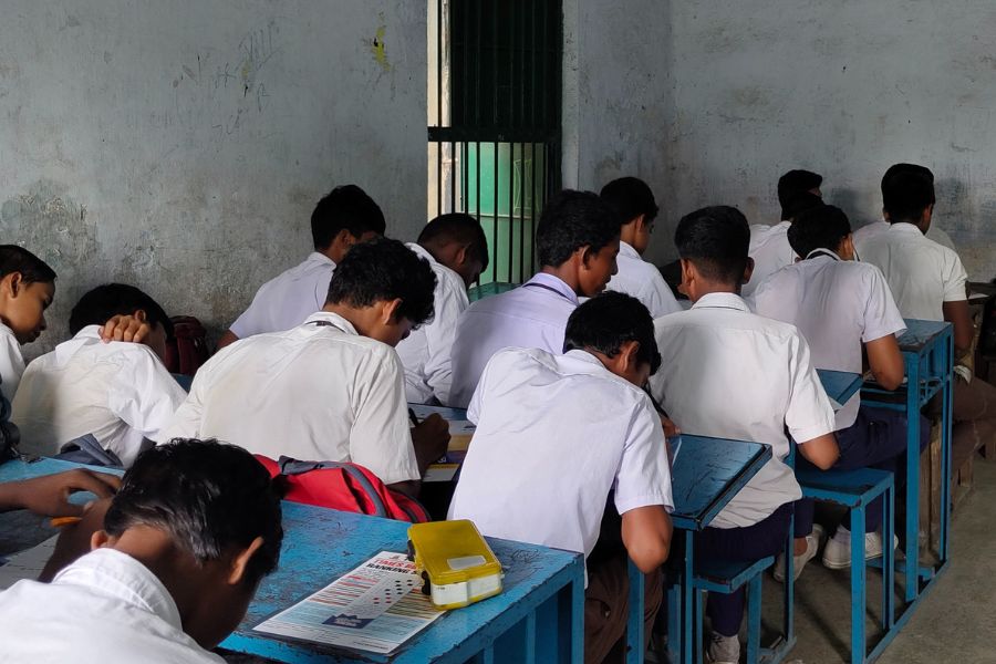 মনোযোগ সহকারে পরীক্ষা দিচ্ছে আসানসোল চেলিডাঙ্গা হাই স্কুলের এক পরীক্ষার্থী