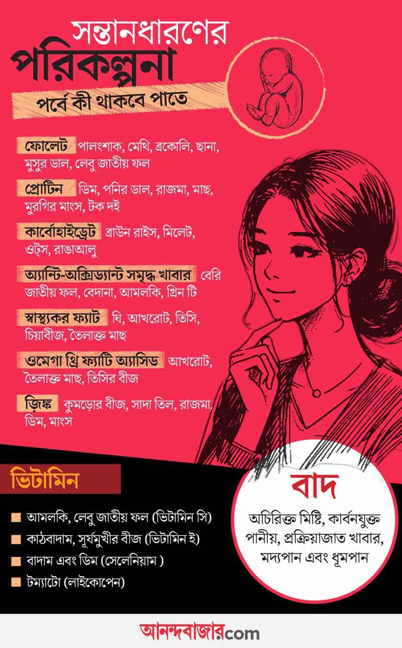 শম্পা বলছেন, ‘‘পরিবার পরিকল্পনা করার সময় থেকেই স্বাস্থ্য নিয়ে নারী-পুরুষ, দু’জনেরই সচেতনতা প্রয়োজন। বিশেষত, মহিলাদের ক্ষেত্রে ওজন ঠিক রাখা দরকার। ওজন কম-বেশি হলে, উপযুক্ত ডায়েটের মাধ্যমে তা স্বাভাবিক করার চেষ্টা করতে হবে। একই সঙ্গে দেখতে হবে, হিমোগ্লোবিনের মাত্রা ঠিক আছে কি না। আয়রন, ভিটামিন বি১২, ফোলিক অ্যাসিড, ভিটামিন ডি, ক্যালশিয়ামের মাত্রা ঠিক থাকা খুবই জরুরি। এ ছাড়াও পর্যাপ্ত পরিমাণে জল খাওয়া জরুরি। দরকার প্রোটিন এবং স্বাস্থ্যকর ফ্যাটেরও।’’