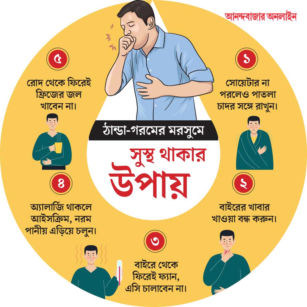 এই পরিস্থিতিতে সুস্থ থাকার উপায় জানালেন চিকিৎসক। অদ্রিজার বলেন, ‘‘আবহাওয়ার এমন খামখেয়ালিপনায় মূলত দু’টি সমস্যা হয়। সর্দি-কাশি আর পেটের গোলমাল। কখনও খুব ঠান্ডা, আবার এই দরদর করে ঘাম ঝরছে কপাল থেকে। এক বার সোয়েটার, পরক্ষণেই শীতাতপ নিয়ন্ত্রিত যন্ত্রের হাওয়ায় স্বস্তি পাওয়া। এ সব তো লেগেই রয়েছে। ফলে বিভিন্ন আবহাওয়ার সংস্পর্শে এসে খারাপ হচ্ছে শরীর। ঘাম বসে আরও বেশি ঠান্ডা লেগে যাচ্ছে। এ বার এটা যে শীতকালে ঠান্ডা লেগে হচ্ছে নাকি, আবহাওয়ার হেরফেরে হচ্ছে, তা অনেক সময়ে বোঝা যায় না। তাতেই আরও সমস্যা বাড়ে।’’