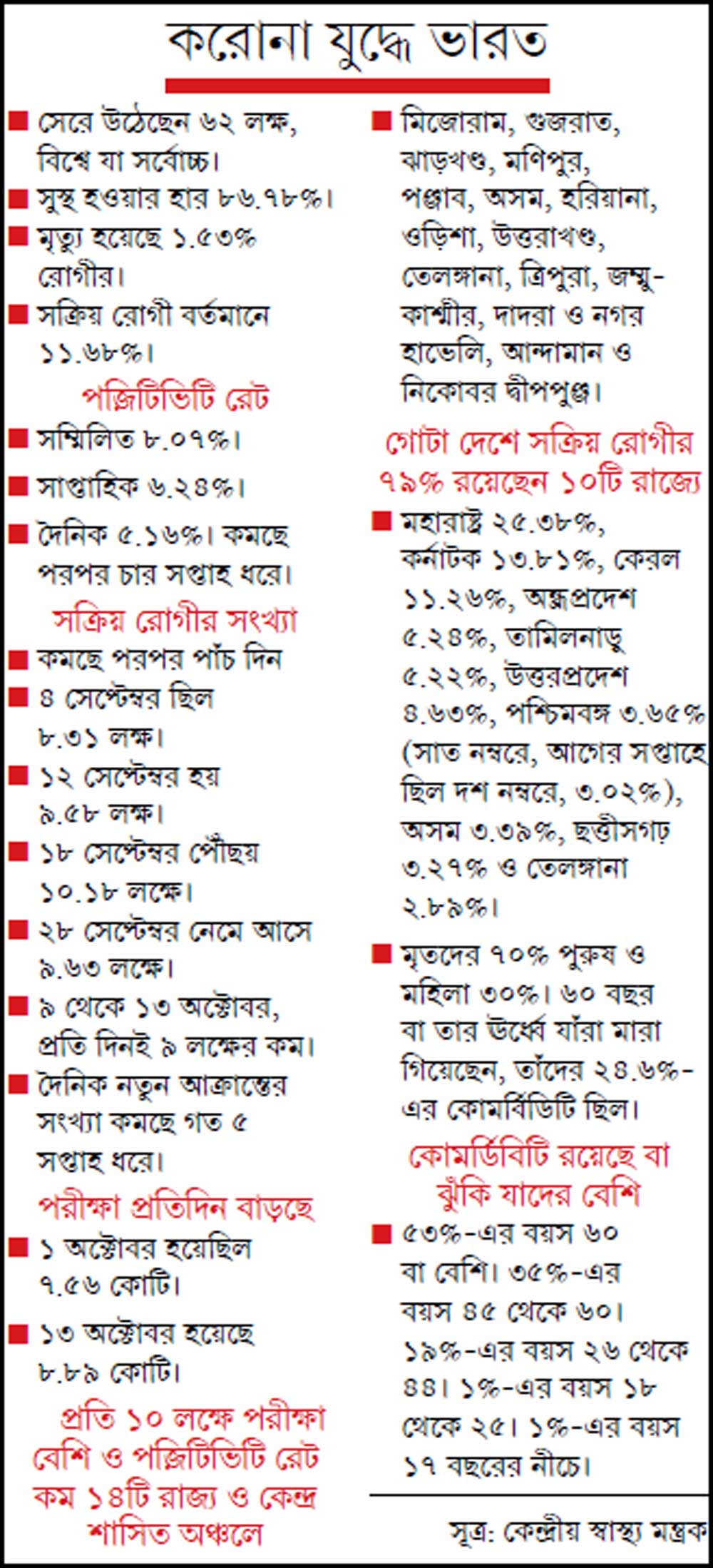 স্বাস্থ্যমন্ত্রী জানিয়েছেন, দেশে এই পর্যন্ত ৬২,২৭,২৯৫ জন কোভিড রোগী সেরে উঠেছেন। সুস্থ হয়ে ওঠার হার এখন ৮৬.৭৮%, বিশ্বে যা সর্বোচ্চ। মৃত্যুর হার বিশ্বে সবচেয়ে কম, ১.৫৩%। সংক্রমণ দ্বিগুণ হওয়ার সময় ৭৪.৯ দিনে তুলে আনা গিয়েছে গত তিন দিনে। করোনা পরীক্ষার ল্যাবরেটরির সংখ্যা বেড়ে হয়েছে ১৯২৭। এতে দিনে ১৫ লক্ষ নমুনা পরীক্ষার ক্ষমতা তৈরি হয়েছে। গত ২৪ ঘণ্টায় প্রায় ১১ লক্ষের কাছাকাছি পরীক্ষা হয়েছে গোটা দেশে।