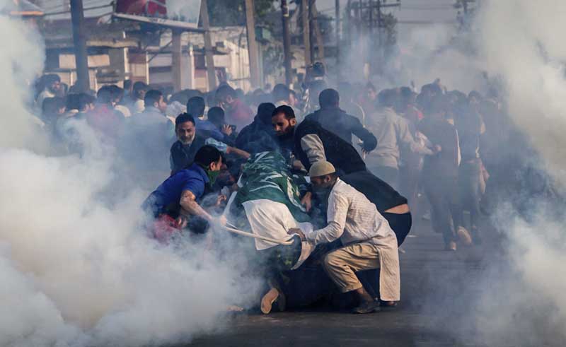 শেষকৃত্যের মিছিল থেকে বিক্ষোভকারীদের হঠাতে কাঁদানে গ্যাস। ছবি: এপি।