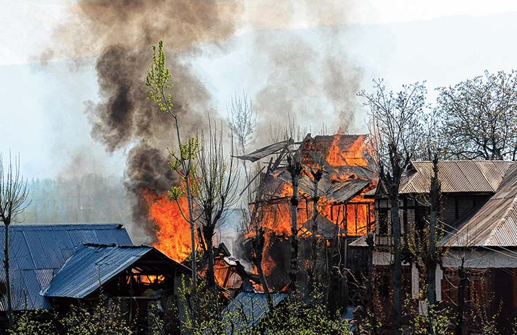 লেলিহান: গুলির লড়াই চলাকালীন আগুন ধরে যায় একটি বাড়িতে। রবিবার শোপিয়ানে।