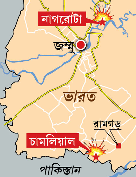 জম্মু-শ্রীনগর সড়কের উপরে নাগরোটা-য় সেনার ১৬ কোরের সদর দফতর। পাশেই রয়েছে ১৬৬ মিডিয়াম আর্টিলারি রেজিমেন্টের শিবির। আজ ভোর সাড়ে পাঁচটা থেকে ছ’টার মধ্যে সেই শিবিরেই ঢুকে পড়ে চার ফিদায়েঁ জঙ্গি। সেনা সূত্রে খবর, পুলিশের উর্দি পরে আসায় প্রথমে তাদের চিনতে ভুল করেছিলেন সেনা শিবিরের রক্ষীরা। গেটের কাছে পৌঁছে প্রথমে গ্রেনেড ছোড়ে হামলাকারীরা। তার পরে সোজা ঢুকে পড়ে শিবিরে। শুরু হয় এলোপাথাড়ি গুলিবর্ষণ। গেটের কাছেই দাঁড়িয়ে ছিলেন বছর ছত্রিশের মেজর গোসাভি কুনাল মান্নাদির। জঙ্গিদের গুলিতে আহত হন তিনি। ততক্ষণে চমক কাটিয়ে সেনারাও জবাব দিতে শুরু করেছেন। দু’তরফে গুলিবর্ষণের মাঝে দীর্ঘক্ষণ আহত মেজরকে উদ্ধার করা যায়নি। শেষ পর্যন্ত মৃত্যুই হয় তাঁর। ল়ড়াইয়ের মধ্যেই গেটের পাশে এল-আকৃতির অফিসার্স মেসে ঢুকে পড়ে জঙ্গিরা। সেখানে প্রাতরাশ খেতে আসা রাষ্ট্রীয় রাইফেলসের তিন জওয়ান কদম শম্ভাজি যশবন্তরাও, উথাপা ও অসীম রাই তাদের গুলিতে নিহত হন।
