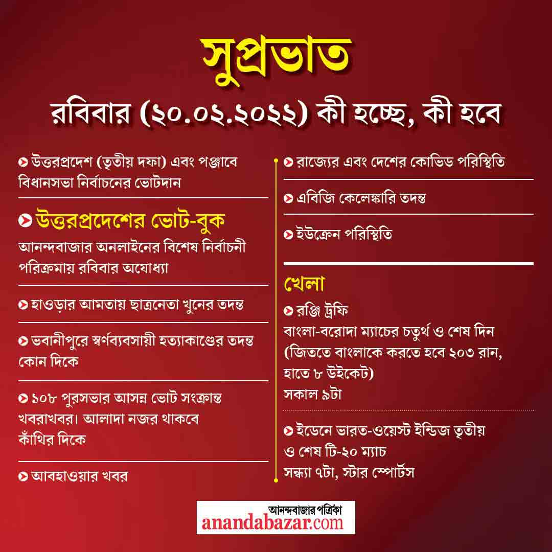 আজ, রবিবার উত্তরপ্রদেশ বিধানসভা নির্বাচনের তৃতীয় দফার ভোটগ্রহণ রয়েছে। এই দফায় ৫৯টি আসনে ভোট হবে। উল্লেখযোগ্য আসনের মধ্যে রয়েছে হাথরস, ফিরোজাবাদ। এ ছাড়া আজ পঞ্জাবের বিধানসভা নির্বাচনেরও ভোটগ্রহণ।