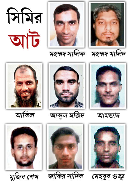 মধ্যপ্রদেশ পুলিশের দাবি, রবিবার দীপাবলির রাতে ২টো থেকে ৩টের মধ্যে ভোপালের সেন্ট্রাল জেলে কনস্টেবল রামশঙ্কর যাদবকে ধারালো অস্ত্র দিয়ে খুন করে সিমি-র আট সদস্য। পুলিশের দাবি, ওরা জেলের প্লেট ও চামচে শান দিয়ে ধারালো অস্ত্র তৈরি করেছিল। তা দিয়েই রামশঙ্করকে খুন করা হয়। আর এক রক্ষীকে বেঁধে ফেলে ওই আট জন। তার পর চাদর দিয়ে তৈরি একটা লম্বা দড়ি বেয়ে একের পর এক দেওয়াল টপকে উধাও হয়ে যায় তারা। পুলিশের খাতায় এদের নাম মহম্মদ সালিক, মহম্মদ খালিদ, মেহবুব গুড্ডু, মুজিব শেখ, আব্দুল মজিদ, জাকির হুসেন শেখ, আমজাদ ও আকিল। রাষ্ট্রদ্রোহ, জঙ্গি কার্যকলাপ ও ডাকাতির মতো গুরুতর অভিযোগে বিচারাধীন এই আট জনকে নিয়ে পুলিশের মাথাব্যথা অবশ্য দীর্ঘদিন। ২০১৩ সালে এদের তিন জন খাণ্ডোয়া জেল থেকে পালিয়েছিল। চলতি বছরের গোড়ায় ফের ওড়িশা থেকে গ্রেফতার হয় তারা।