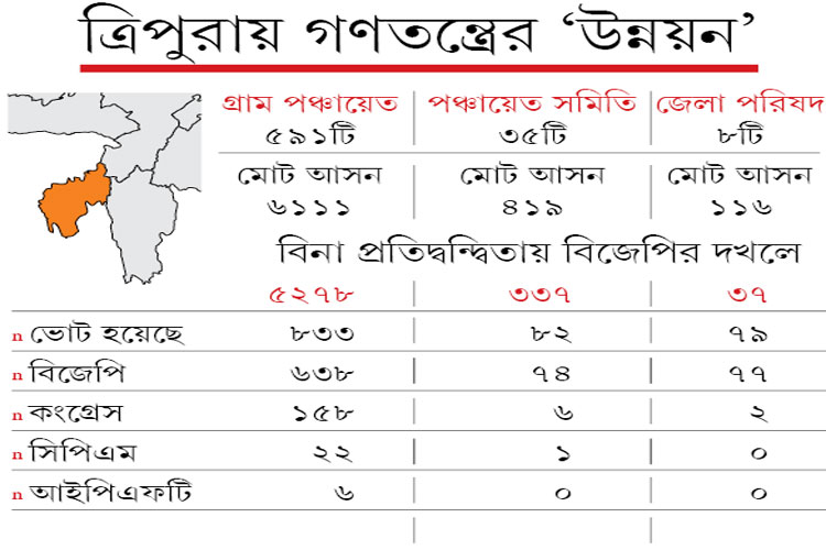 পশ্চিমবঙ্গের পঞ্চায়েত নির্বাচনের সময় বীরভূমের তৃণমূল সভাপতি অনুব্রত মণ্ডল বলেছিলেন, বিরোধীরা মনোনয়ন জমা দিতে গিয়ে দেখবেন রাস্তায় ‘উন্নয়ন’ দাঁড়িয়ে আছে। ত্রিপুরার বিরোধীদেরও গুচ্ছ গুচ্ছ অভিযোগ ছিল, তাদের প্রার্থীদের রাস্তায়, ব্লক অফিসে, মহকুমাশাসকের অফিসে আটকে মনোনয়নপত্র ছিঁড়ে, মারধর করে বিজেপি কর্মী তথা ‘উন্নয়ন’ ফেরত পাঠিয়েছে। বিজেপি কর্মী-সমর্থকদের ভয়ে বহু জায়গায় মানুষ ভোটে দাঁড়াতেই ভরসা পাননি। মনোনয়ন পর্ব শেষ হওয়ার পর দেখা যায়, পশ্চিমবঙ্গের বহু আলোচিত গত পঞ্চায়েত ভোটের রেকর্ড ভেঙে তছনছ করে দিয়েছেন ত্রিপুরার বিজেপি নেতৃত্ব। পশ্চিমবঙ্গে শাসক তৃণমূল কংগ্রেস ৩৪% আসন বিনা প্রতিদ্বন্দ্বিতায় জিতেছিল। ত্রিপুরায় বিজেপি জিতেছে ৮৫ শতাংশ আসন।