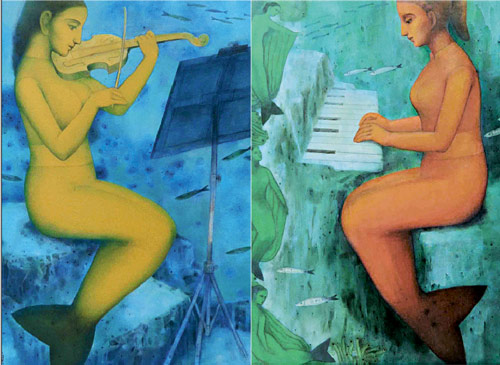 তবে এই ছবিটির থেকেও ফর্মের পরীক্ষায় অনেক দুঃসাহসী লেগেছে ওঁর জলতলে মৎস্যকন্যার ছবিটিকে। একেবারে জীবন্ত ও প্রাণময় দৃষ্টিতে চেয়ে-থাকা যে কল্পনারীর পক্ষীসদৃশ পা দুটি ক্যানভাসের নীচের তলে এসে নিজেরই নারীসত্তার দ্বিতীয় এক শায়িত মুখাবয়বের উপরে আটটি বিস্তৃত নখের ভারসাম্যতায় বসে থাকে অপার মগ্নতায়। আসলে বাস্তব ও পরাবাস্তবের জগতে শিল্পীর নিয়ত কল্পভ্রমণের এ এক নিখুঁত প্রতীকায়ন!