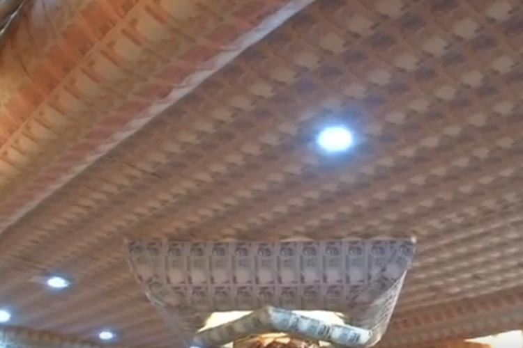 মন্দিরের সিলিং সাজানো হয়েছে টাকা দিয়ে।