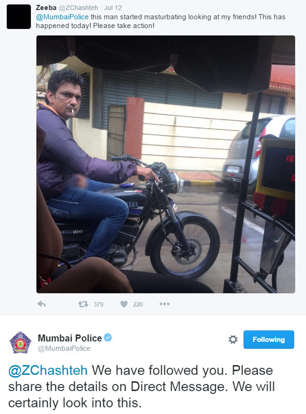 টুইটারে মুম্বই পুলিশকে জানানো অভিযোগে ওই তরুণী লেখেন, ‘এই লোকটি আমার বন্ধুকে দেখে স্বমৈথুন করছিল। আজকেই এটা হয়েছে। দয়া করে ব্যবস্থা নিন।’ গত ১২ জুলাই বিকেল ৪টে ১৮ মিনিটে পোস্ট করা ওই তরুণীর টুইটারের জবাব আধ ঘণ্টার মধ্যেই দেওয়া হয় মুম্বই পুলিশের তরফে। সেখানে বলা হয়, ‘আমরা আপনাদের অভিযোগ পেয়েছি। ডির্কেট মেসেজে সবিস্তার জানান। আমরা অবশ্যই দেখব।’ এর পরেই ওই যুবক এবং তার বাইকের ছবি তুলে ফের পোস্ট করেন তাঁরা। এর ঘণ্টা তিনেকের মধ্যেই বান্দ্রার বাসিন্দা রইশ লিয়াকত কুরেশি নামে ওই যুবককে গ্রেফতার করে মুম্বই পুলিশ। মুম্বই পুলিশের এক আধিকারিক জানান, ওই তরুণীরা লজ্জায় পড়লেও আসল কাজটি করেছিলেন বলেই অপরাধীকে ধরা সম্ভব হয়েছে। নিজেরা ঘাবড়ে না গিয়ে, চিত্কার চেঁচামেচি না-করে ছবি পাঠিয়ে যে ভাবে আমাদের সাহায্য করেছেন, তা প্রশংসার যোগ্য।