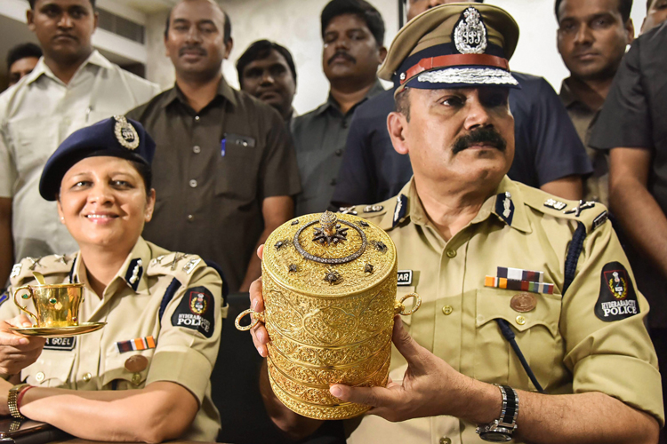 উদ্ধারের পর সোনার টিফিন বাক্স হাতে হায়দরাবাদের পুলিশ কমিশনার অঞ্জনি কুমার (ডান দিকে)। ছবি: পিটিআই।