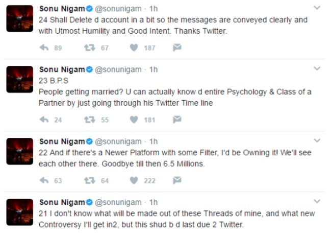 অভিজিতের পাশে দাঁড়িয়ে টুইটার থেকে নিজের অ্যাকাউন্টই সরিয়ে নিলেন সোনু নিগম। অভিজিতের অ্যাকাউন্ট সাসপেন্ড হওয়ার পরই টুইটারে ক্ষোভে ফেটে পড়েন সোনু। অভিজিতের সমর্থনে পরপর ২৪টি টুইট করেন তিনি। তার পরেই অ্যাকাউন্ট ডিলিট করে দেন গায়ক।